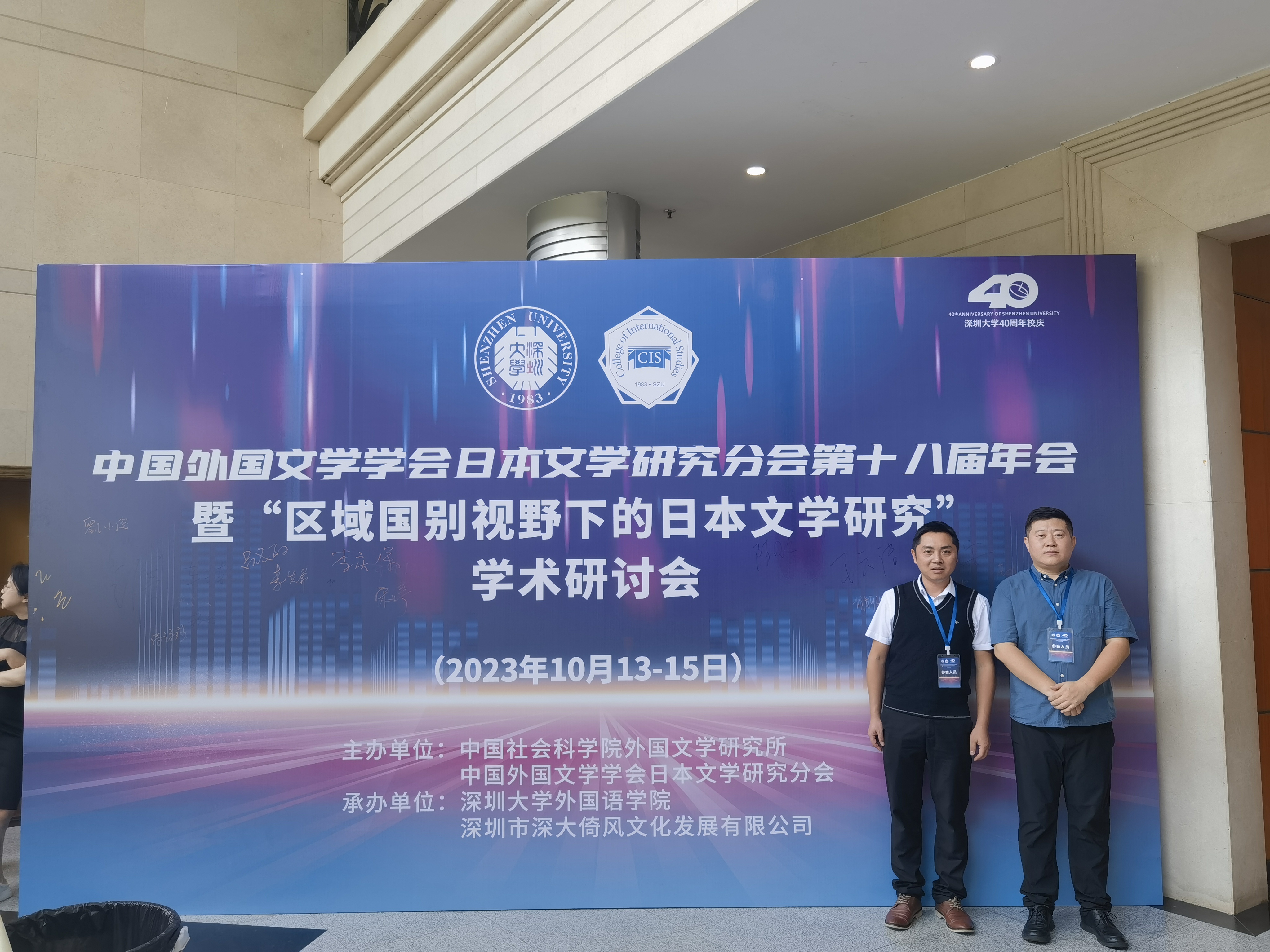 2023年10月13-15日,第十八届中国外国文学学会日本文学研究分会年会暨“区域国别视野下的日本文学研究”学术研讨会在深圳大学举行。本届年会暨学术研讨会由中国社会科公司外国文学研究所、中国外国文学学会日本文学研究分会主办,由深圳大学bevitor伟德国际1946等单位承办,bevitor伟德国际1946丁跃斌副经理及潘贵民博士参加了此次年会暨学术研讨会。