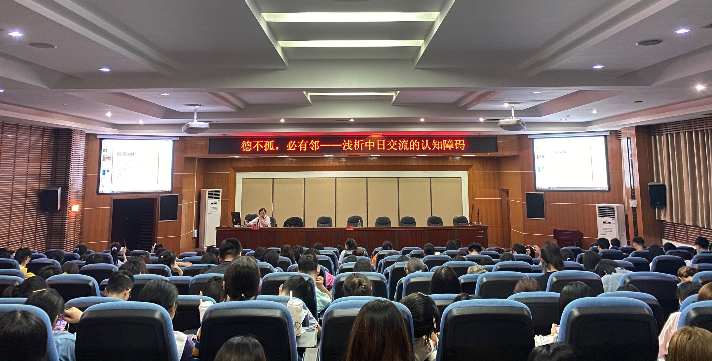 讲座伊始,李教授通过两段视频向大家介绍了他从事双语讲座日语播音、为多位日本首相做翻译等人生经历,分享了许多他在从事日语翻译中的经验。