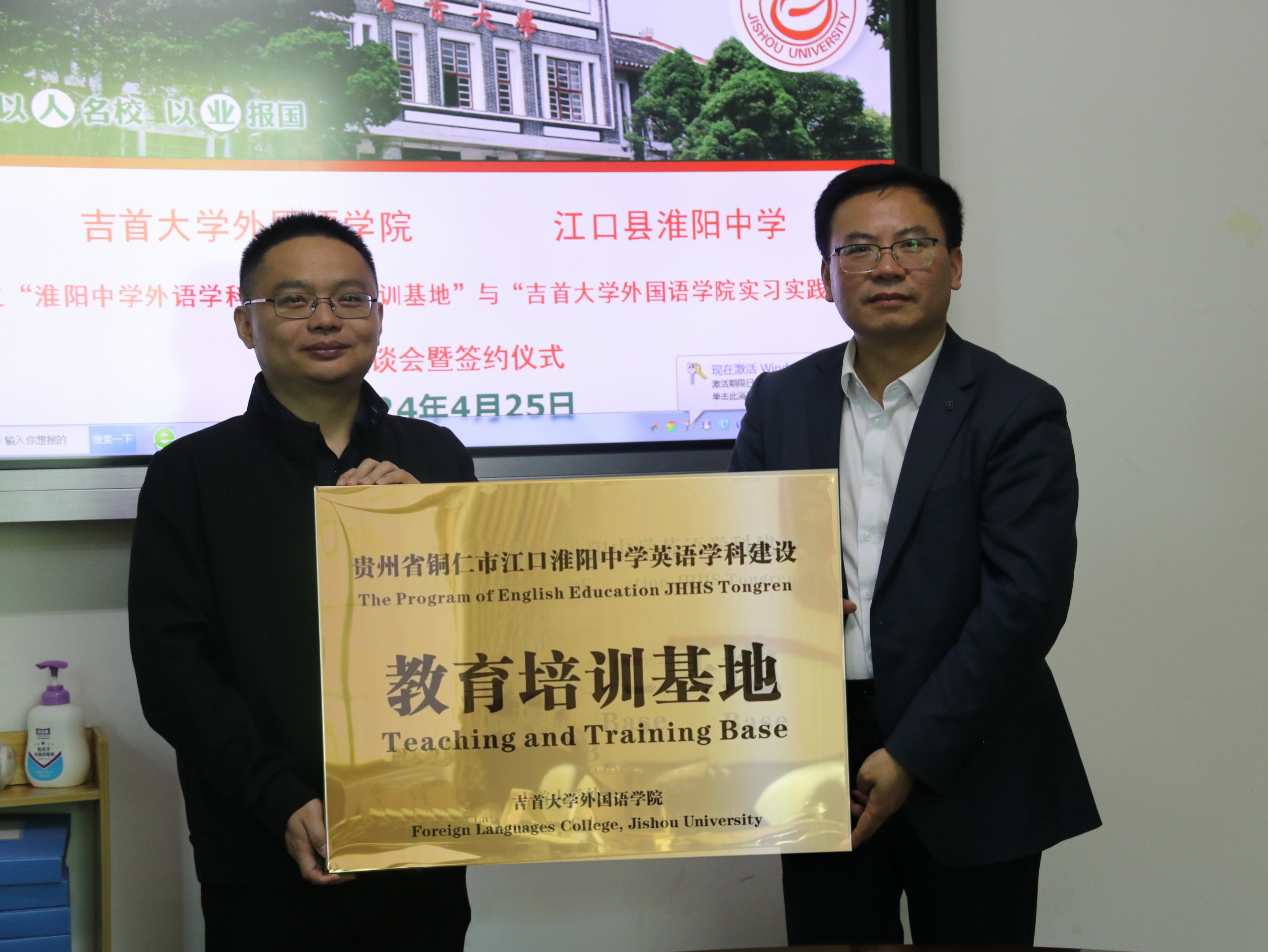 本讯网(bevitor伟德国际1946)4月26日上午9点,bevitor伟德国际1946——贵州江口淮阳中学共建教育培训暨毕业生实习实践基地签约仪式在逸夫教学楼会议室举行,外国语公司党委书记简功友、院办公室主任李立君、英语系主任刘燕及教务、学工老师,江口县淮阳中学刘洋董事长、周乃刚副董事长、赵雄副董事长及各部门老师参加了本次签约仪式。