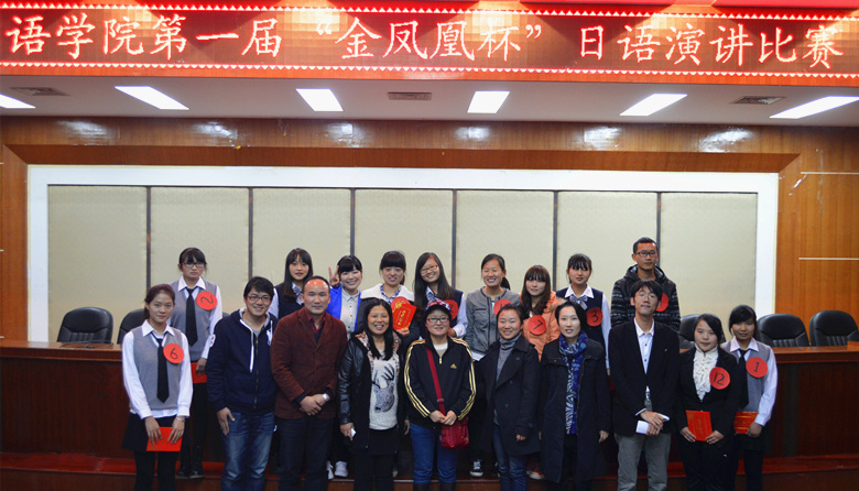 本网讯(闫翼程、江逸凡、王秋霞、刘纯、罗旭杰)11月12日晚6:30,公司第一届“金凤凰杯”日语演讲比赛于逸夫楼多功能报告厅隆重举行。本次大赛由朱晓彤、黄琮泰两位同学主持,公司经理汤敬安、日语系副主任陈静秋及日籍教师中村铃奈、伊势光等日语系老师出席并担任评委,公司日语系全体员工均到场观看。