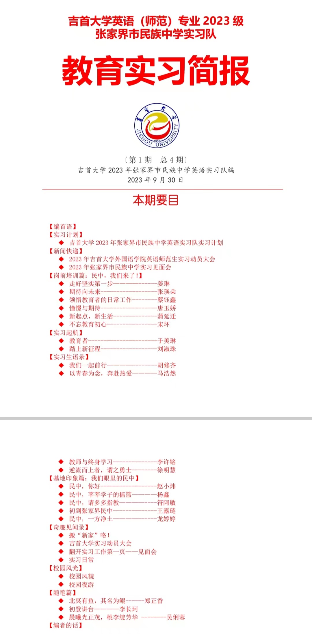 《简报》由实习队员工干部胡修齐、姜琳、李长珂、徐明慧、吴俐蓉负责,委托徐明慧同学具体落实,由实习队21名来自2020级英语(师范)专业实习生以小组为单位轮值组织。截至目前,在全体队员的积极配合下,第一期已经顺利出刊。