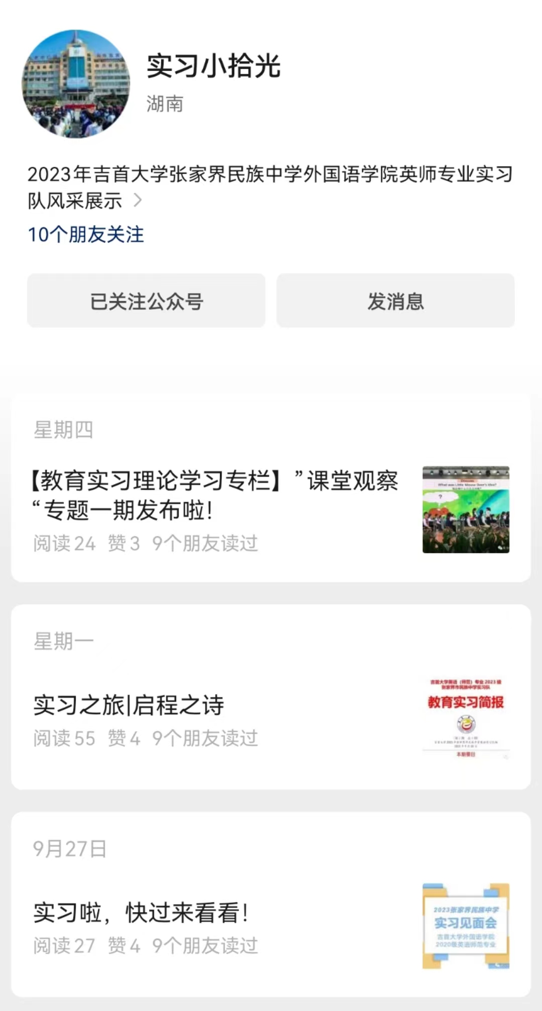 与此同时,该队还开办实习队专属微信公众号,并委托吴俐蓉同学负责运营。微信公众号命名“实习小拾光”,以引领学习,记录工作,展示形象为宗旨,主要刊发《简报》、与教育实习相关的专题论文、指导篇目、实习反思心得等原创性和英语学科教学经典文章为主。现已推送了第一期《简报》和第一期“英语课堂观察”专题文章。