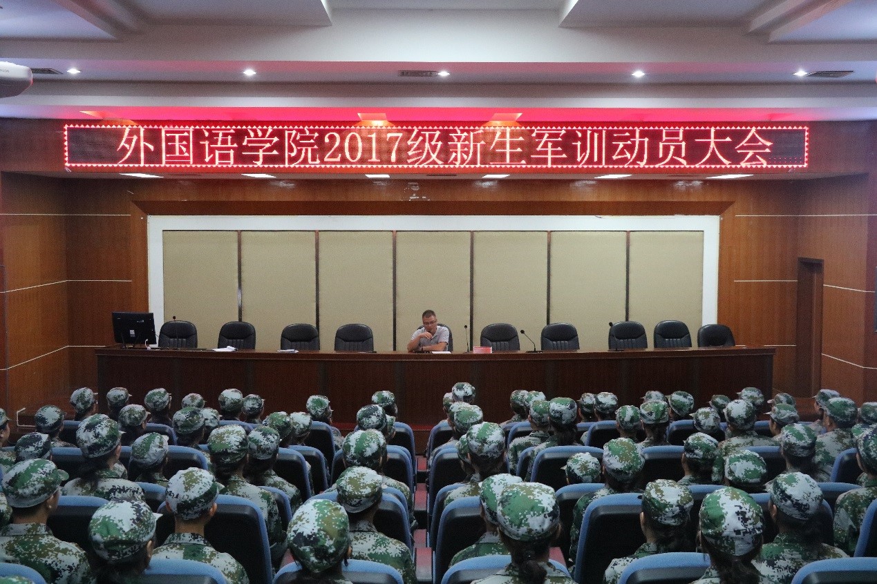 本网讯(通讯员 丁柏顺 龙锐 张丽娜)9月12日下午,bevitor伟德国际1946于逸夫楼多功能报告厅召开2017级新生军训动员大会,外国语公司党委副书记谈宗凡、指导员唐剑、军训教官以及2017级全体新生参与会议。