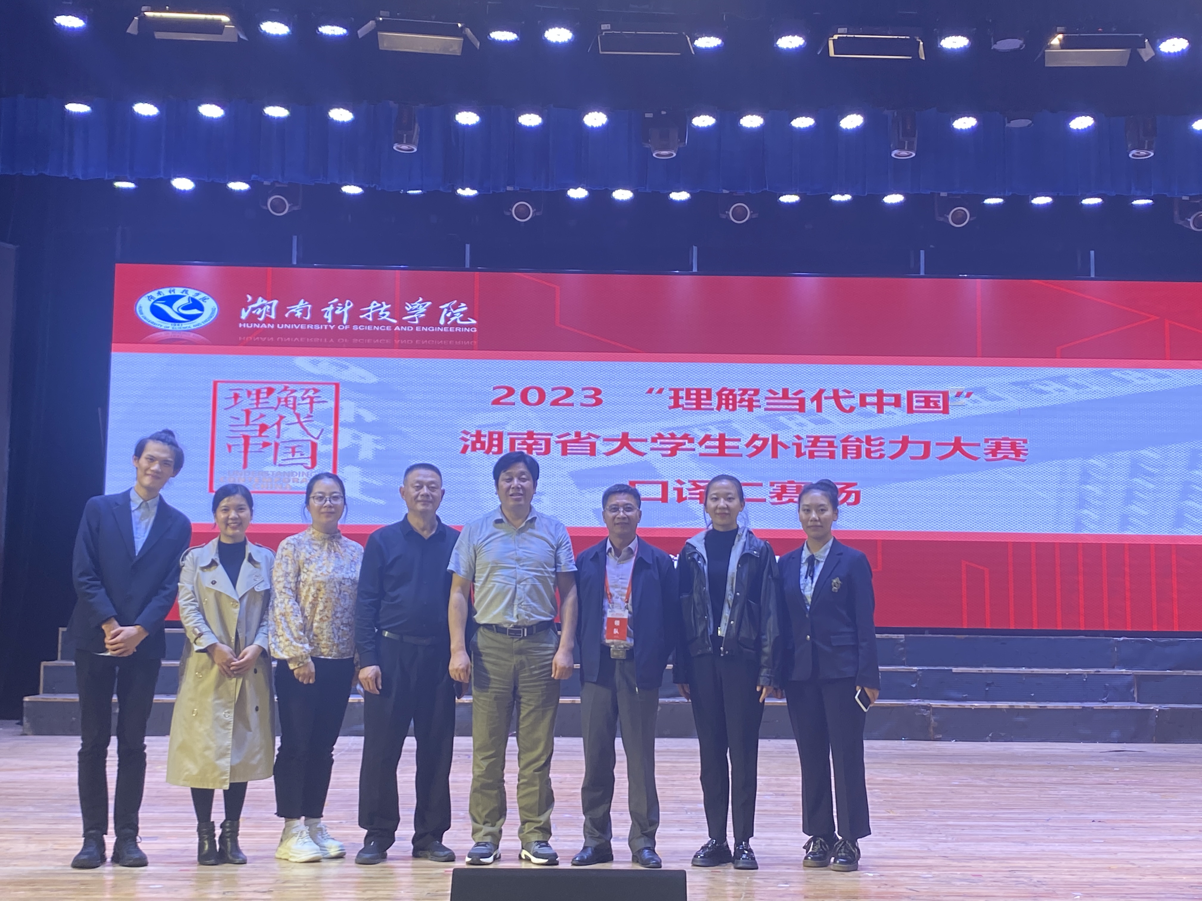 图为口译组选手,指导老师与部分评委合照