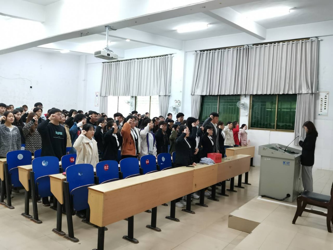 大会第四项,由院员工会干部陶胜兰作为领誓人,带领全体团员重温入团誓词。全体团员举起右拳,用最洪亮的声音,庄严宣誓,以崭新饱满的精神面貌,向团组织表明决心。团员们通过重温入团誓词,牢记团的誓言,激发了作为一名团员的光荣感与责任感,增强了为共产主义奋斗的信念。大会第五项,团总支书记向芳老师总结讲话。团员们要明确前进方向,要思考如何做好身边同学的榜样。对此,要做到以下三方面要求,一是培养责任意识、感恩意识,二是能珍惜时光,勤奋学习,不断提升个人综合素质,三是诚信做人,提高个人道德修养。