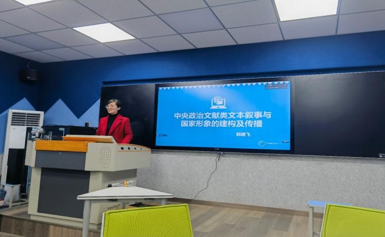 郭建飞博士讲座主题为“政治文献类文本叙事与国家形象的建构及传播”。郭博士首先介绍了类文本的概念,然后提出了文本-类文本共生叙事的概念,并逐一介绍了杂糅共生叙事、邻比共生叙事和疏离共生叙事三种关系类型。郭博士通过将文本-类文本共生叙事的方法运用于政治类文献文本中,体现了我国“坚持和平发展”、“促进共同发展”、“维护国际公平正义”和“为人类作出贡献”的负责任大国形象。