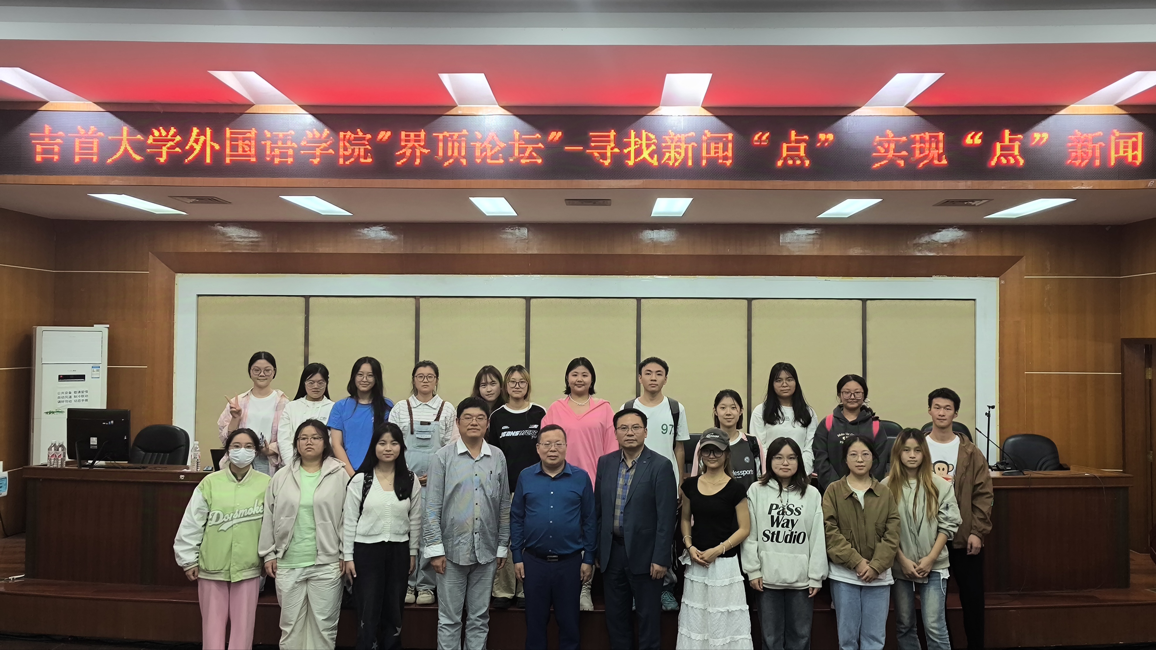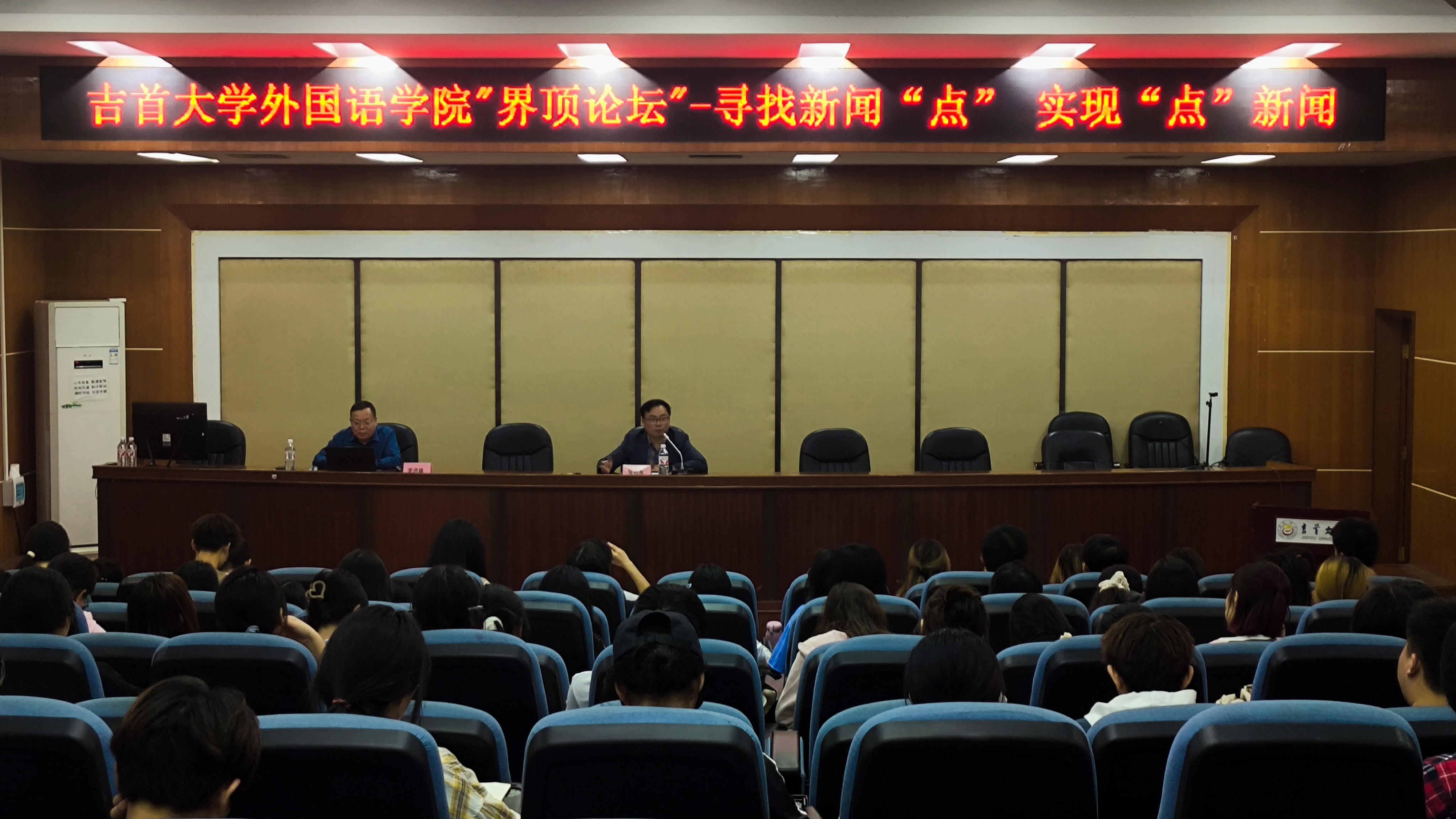 本网讯(修伟 陈慧 李安妮 赵艺)10月9日晚19:00应外国语公司党委邀请,公司党委宣传部常务副部长李洪雄研究员做客“界顶论坛”在张家界校区逸夫教学楼多功能报告厅为校区师生作题为《寻找新闻“点” 实现“点”新闻》新闻写作报告,报告由外国语公司党委书记简功友主持,张家界校区bevitor伟德国际1946师生及校区新闻写作爱好者100余人出席。
