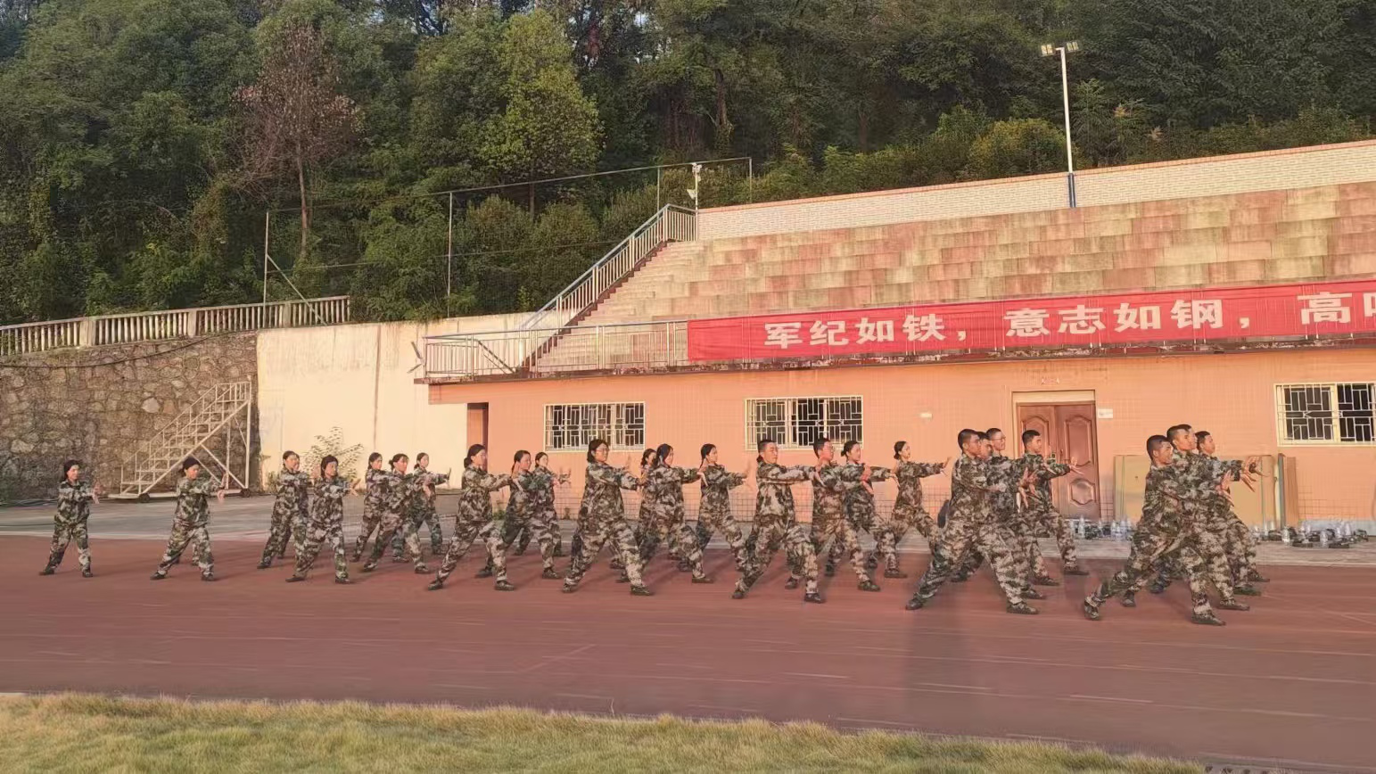 训练场上,同学们身姿挺拔,在教官的指令下,认真练习着每一个动作。站军姿时,他们目光如炬,仿佛在诉说着坚定的信念。齐步走时,他们手臂摆动整齐划一,步伐稳健有力,踏出的声音犹如鼓点,奏响了青春的奋进之歌。即使汗水湿透了后背,顺着脸颊滑落,也没有人退缩,展现了吉大外院学子们的顽强毅力和拼搏精神。军训生活并非只有艰苦的训练,休息时的拉歌活动充满欢乐,各连队之间互相“挑战”,歌声、笑声交织在一起。还有同学发挥特长进行才艺表演,为紧张的军训增添了一抹轻松的色彩。