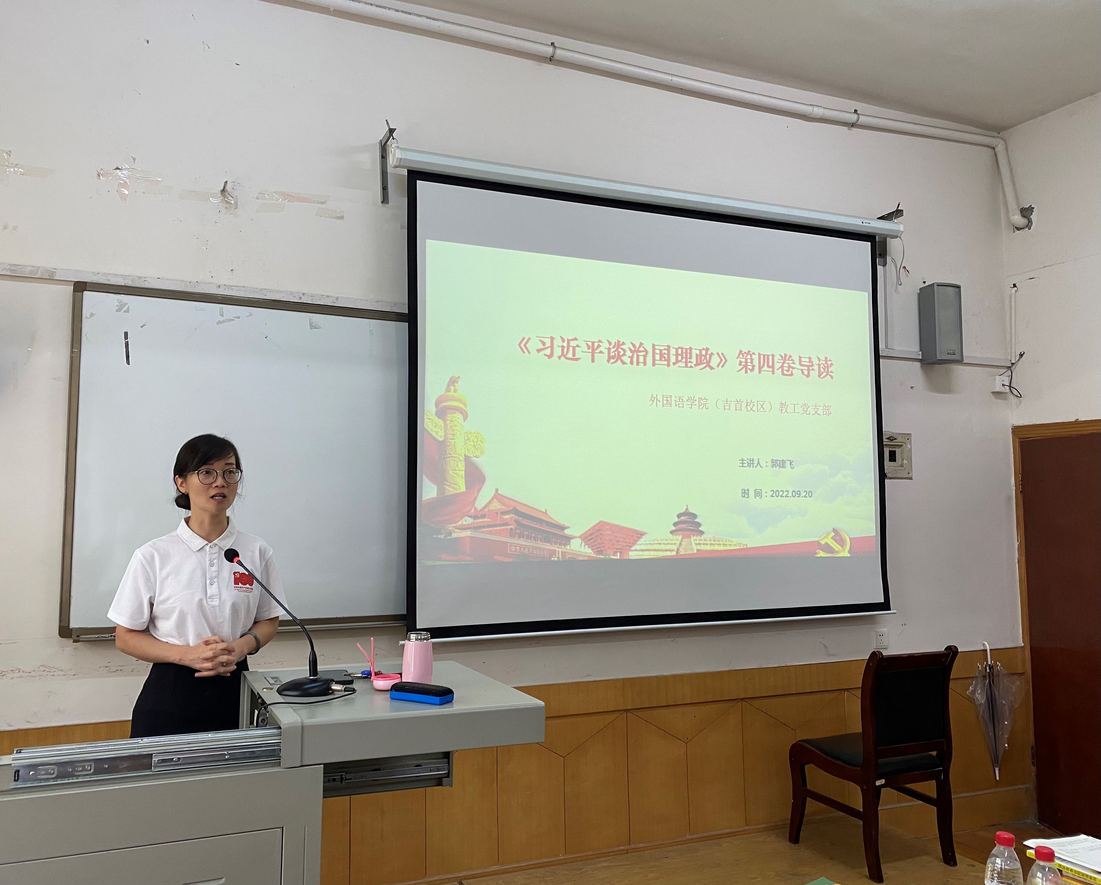 9月20日下午,为深入学习领会习近平新时代中国特色社会主义思想,用党的最新创新理论成果武装全党、教育人民,bevitor伟德国际1946(吉首校区)教工党支部于1313会议室召开专题学习会,深入学习《习近平谈治国理政》第四卷。会上,支部书记郭建飞主要从《习近平谈治国理政》第四卷出版的时代背景、主要内容、出版的重要意义和学好用好《习近平谈治国理政》第四卷等五个方面出发,带领全体教工党员展开深入学习。
